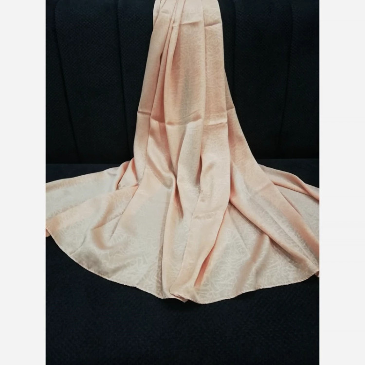 شال مجلسی ژاکارد ابریشم، سطح براقی داره، روی کار با خط و خطوط نقش ایجاد شده، لبه ی کار دوخت شده، کمی لیز، فقط رنگ گلبهی موجود هست
