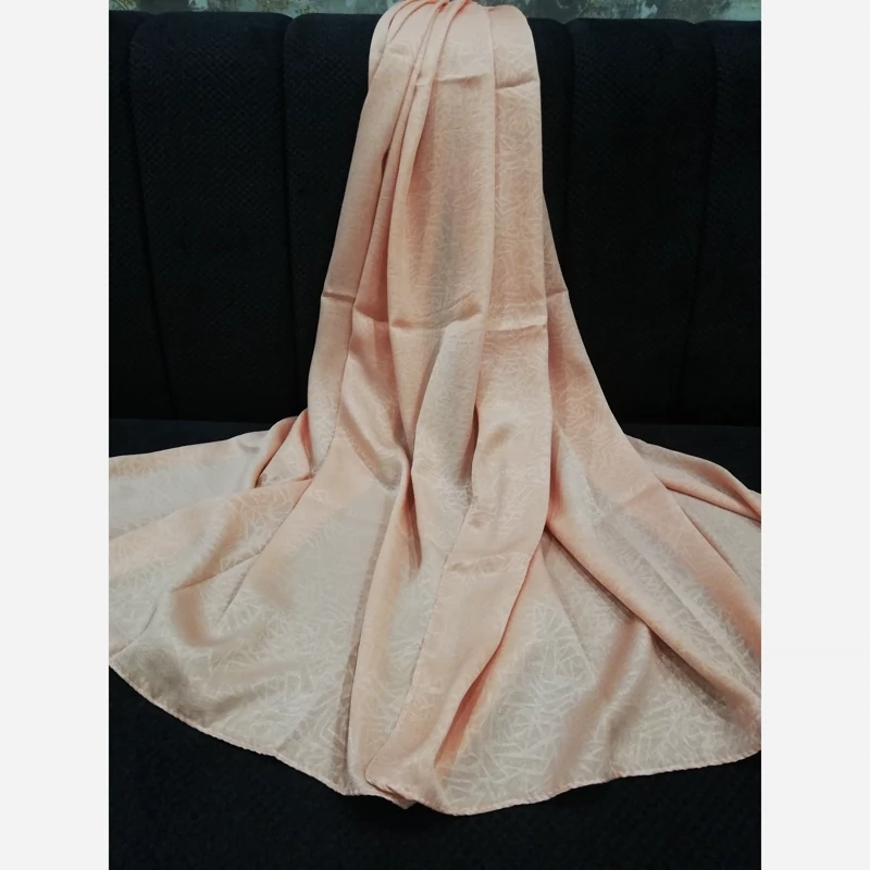 شال مجلسی ژاکارد ابریشم، سطح براقی داره، روی کار با خط و خطوط نقش ایجاد شده، لبه ی کار دوخت شده، کمی لیز، فقط رنگ گلبهی موجود هست